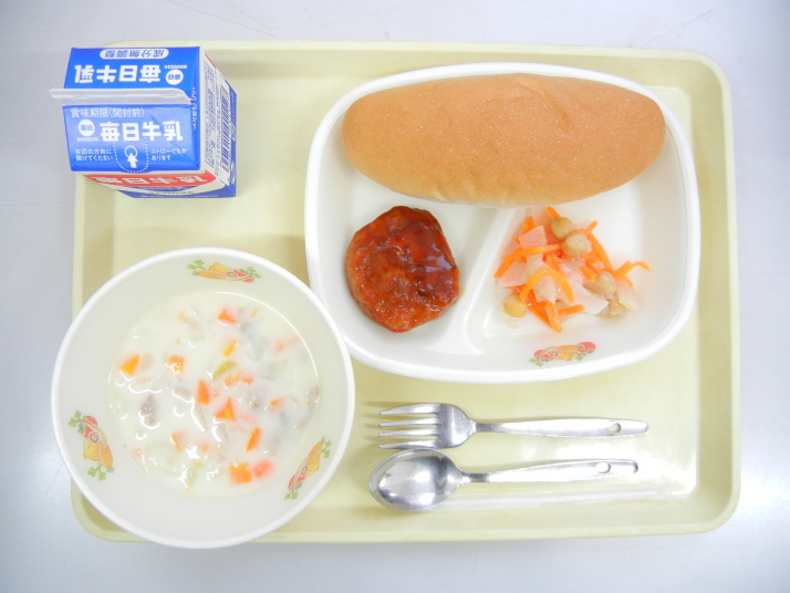 コッペパン ポタージュスープ ハンバーグ ビーンズサラダ 牛乳 |