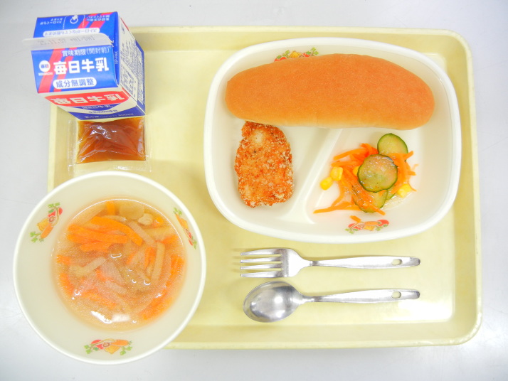 コッペパン ジュリアンスープ 米粉のささみフライ イタリアンサラダ 柏原のデラウェアジャム 牛乳 |