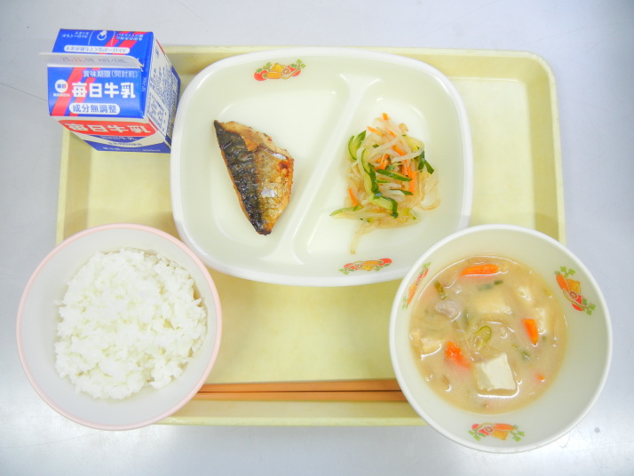 ご飯 豆腐の味噌汁 さばの塩焼き もやしときゅうりの和え物 牛乳 |