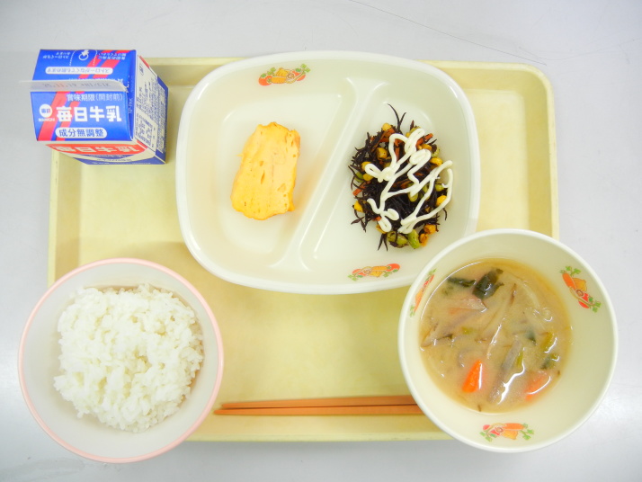 | ご飯 豚汁 だし巻きたまご ひじきサラダ 牛乳 |