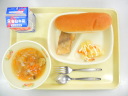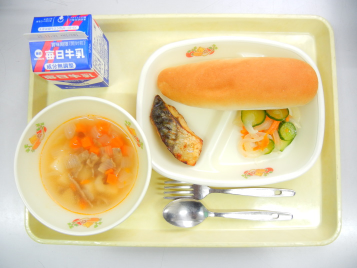 コッペパン オニオンスープ 白身魚のから揚げ ~柏原ワインの アップルソース~ ポテトサラダ 牛乳 |