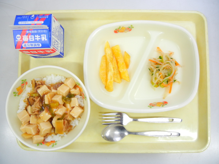 ご飯 マーボー丼 中華ポテト もやしのナムル 牛乳 |