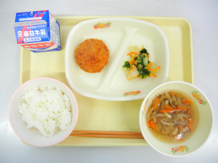 | ご飯 沢煮椀 ミンチカツ ほうれん草のおひたし 牛乳 |