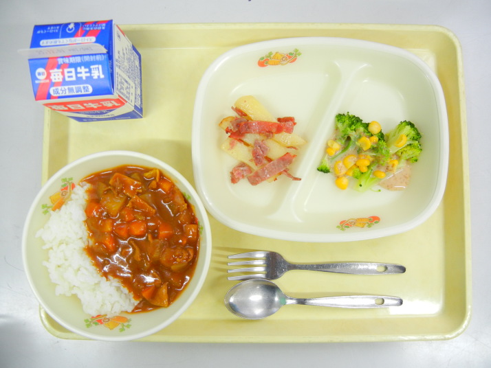 ご飯 米粉のポークカレー ポテトのマヨドレ焼き ブロッコリーのサラダ 牛乳 |