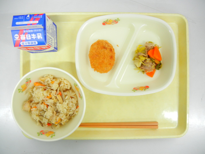 | 鶏肉とごぼうの炊き込みご飯 まぐろカツ チンゲン菜の煮浸し 牛乳 |