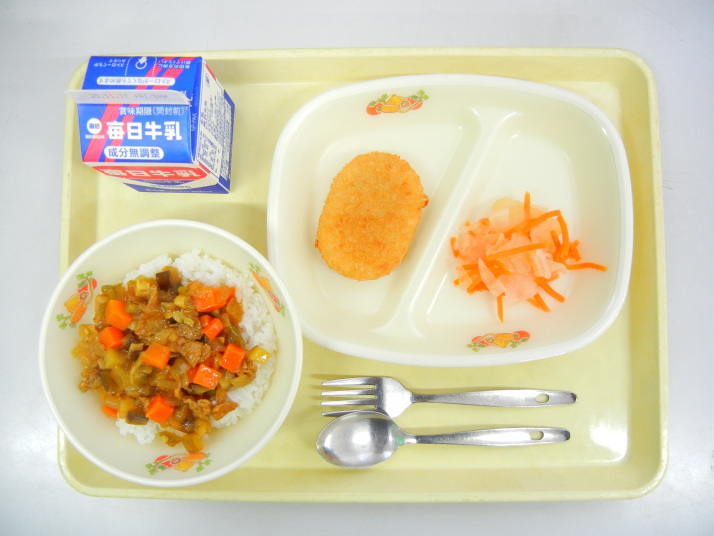 ご飯 森宮さん家の ドライカレー コロッケ だいこんのさっぱり和え 牛乳 |