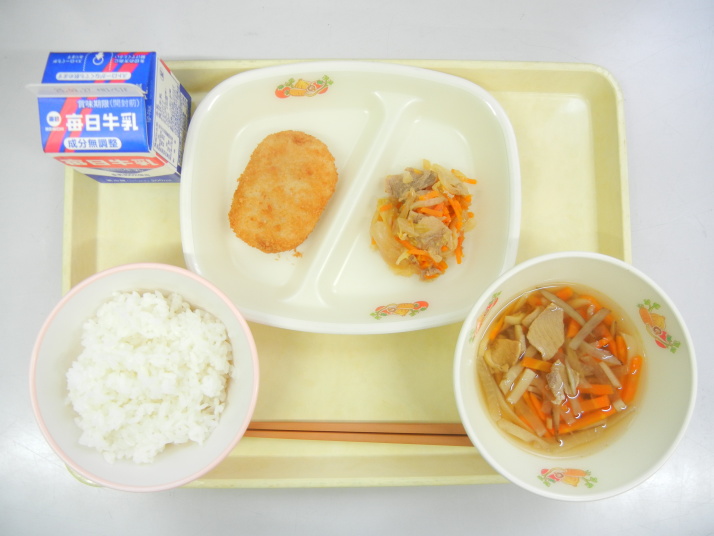 ご飯 沢煮椀 コロッケ 豚肉と野菜の炒め煮 牛乳 |