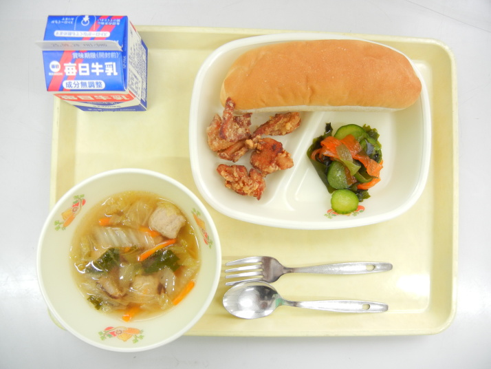 コッペパン 肉団子の中華スープ とりにくのから揚げ 中華和え 牛乳 |