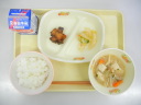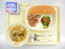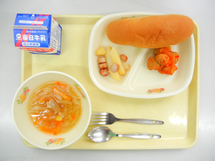 コッペパン 野菜たっぷりスープ ポテトのマヨドレ焼き チキンボールのトマト煮 牛乳 |