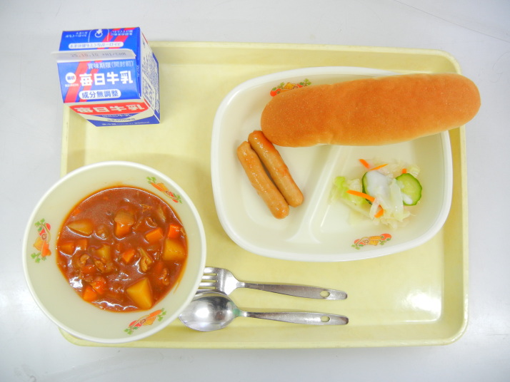 ご飯 米粉のポークカレー フランクフルト イタリアンサラダ 牛乳 |