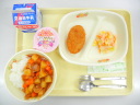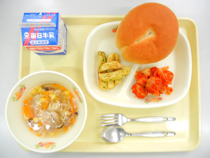 さつまいもコッペ 野菜たっぷりスープ 米粉のささみフライ 新じゃがのコロコロソテー 牛乳 |