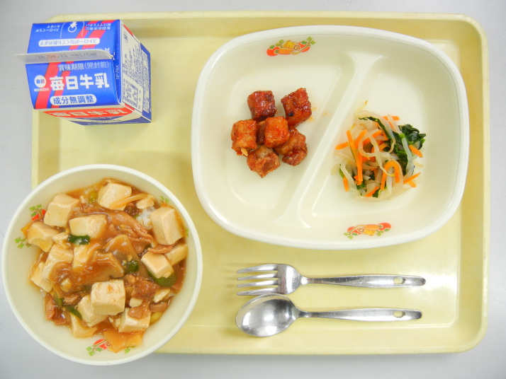 | マーボー丼ぶり 豚からの甘酢あん もやしとほうれん草の 和え物 牛乳 |