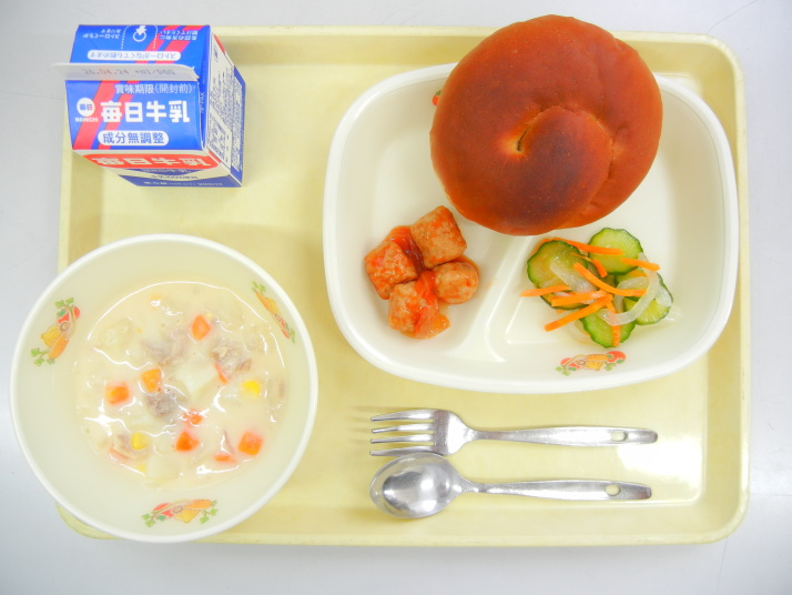 黒糖パン クリームシチュー チキンボールのケチャップソース きゅうりのサラダ 牛乳 |