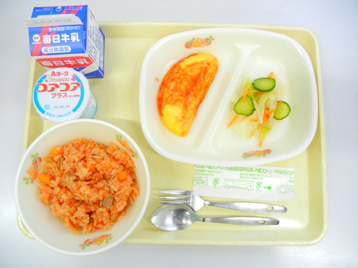 チキンライス オムレツ イタリアンサラダ ヨーグルト 牛乳 |