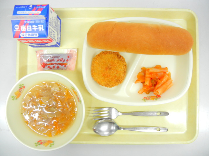コッペパン 新玉ねぎのスープ ミンチカツ 米粉のマカロニケチャップソテー メープルジャム 牛乳 |