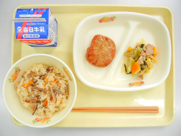 | かやくごはん 和風ハンバーグ 小松菜の煮びたし 牛乳 |